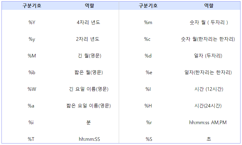 SQL에서 데이트 형식을 변경 할때는 date_format(컬럼, 형식) 을 사용한다. 형식의 경우는 '%Y-%m-%d' 형식을 사용하며 대소문자에 따라 출력 되는 형식이 다르다.