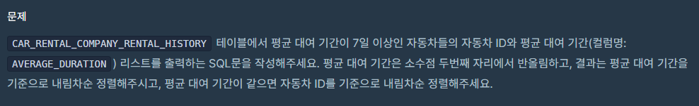 윈도우함수를 써주신 건 너무 좋은 발상이신데요~ 윈도우함수는 '각 행'에 적용되서 car_id별로 avg를 모두 갖게 되어 중복행이 많이 발생합니다. group by로 중복행을 없애려고 시도해주신건 너무 좋은데, 데이터가 유실되고있어요.(group by 전후 결과를 확인해보시면 알수있습니다!) 데이터를 유실하지 않고 group by로 바로 평균을 구하면 데이터를유실하지 않습니다 ㅎㅎ 대여기간도 '7일 이상'이기 때문에 >=로 고쳐주셔야 해요 ㅎㅎ