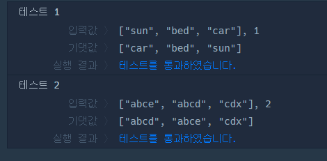 문자열로 구성된 리스트 strings와, 정수 n이 주어졌을 때, 각 문자열의 인덱스 n번째 글자를 기준으로 오름차순 정렬하려 합니다. 예를 들어 strings가 ["sun", "bed", "car"]이고 n이 1이면 각 단어의 인덱스 1의 문자 "u", "e", "a"로 strings를 정렬합니다.