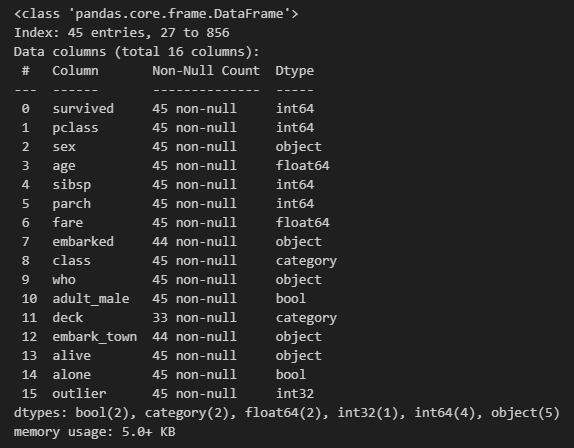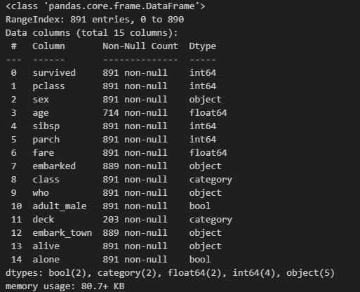 age, embarked, deck, embark_town 에서 null이 존재하는것 처럼 보임. 그럼 이것을 확인해볼까?